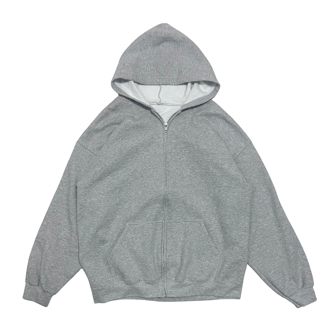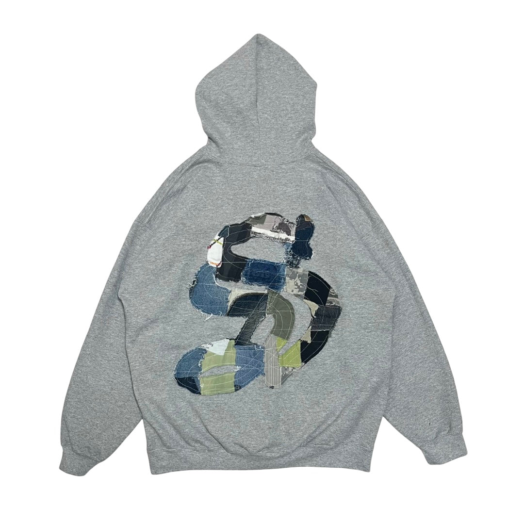 Zip up hoodie with handmade patchwork logo made from recycled fabrics in an effort to reduce textile waste.